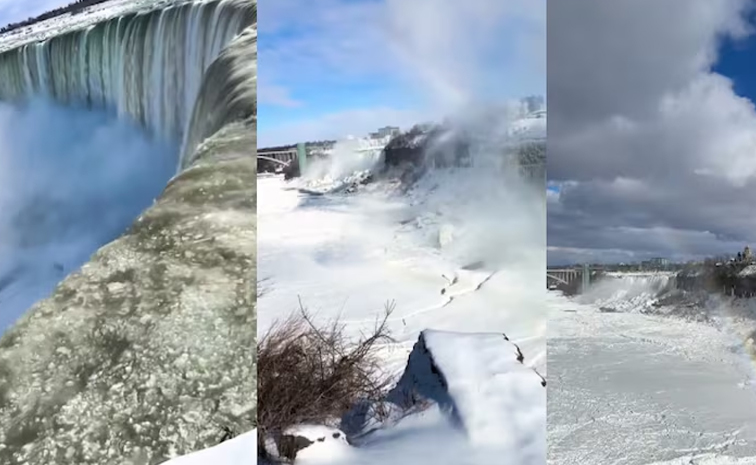 నయాగరా జలపాతం గడ్డకట్టి, అద్భుతమైన దృశ్యాలతో అలరారుతోంది. నయాగరా నది అంచుల దగ్గర పాక్షికంగా గడ్డకట్టినట్లు కనిపిస్తుంది. తీవ్రమైన చలి ఉన్నప్పటికీ లక్షలాది లీటర్ల నీరు జలపాతంపై ప్రవహిస్తుంది.ప్రతి సెకనుకు లక్షలాది లీటర్ల నీరు అంచుల నుండి ఉరుములు మెరుపులతో ఉప్పొంగుతూనే ఉంది. శీతలగాలులు, పొగమంచుకి విరుద్ధంగా, ప్రవహించే నీరు, ఘనీభవించిన ఉపరితలాలు పక్కపక్కనే వీడియోలు నెట్టింట సందడిగామారాయి.