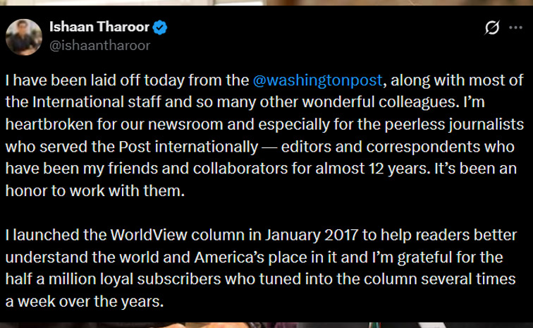సుమారు 12 ఏళ్లుగా ‘వాషింగ్టన్ పోస్ట్’లో పనిచేస్తున్న ఇషాన్ థరూర్ తన నిష్క్రమణపై సోషల్ మీడియా వేదికగా ఆవేదన వ్యక్తం చేశారు. ‘ఈ రోజు వాషింగ్టన్ పోస్ట్ నుండి నాతో పాటు అనేకమంది అంతర్జాతీయ సిబ్బందిని తొలగించారు. మా న్యూస్రూమ్, ముఖ్యంగా విదేశాల్లో అద్భుతమైన సేవలు అందించిన నా సహచరుల కోసం నా హృదయం ద్రవిస్తోంది’ అని ఇషాన్ పేర్కొన్నారు. ఖాళీగా ఉన్న న్యూస్రూమ్ ఫోటోను షేర్ చేస్తూ, ఇది తన జీవితంలో ఒక చెడ్డ రోజు అని ఆయన అభివర్ణించారు.