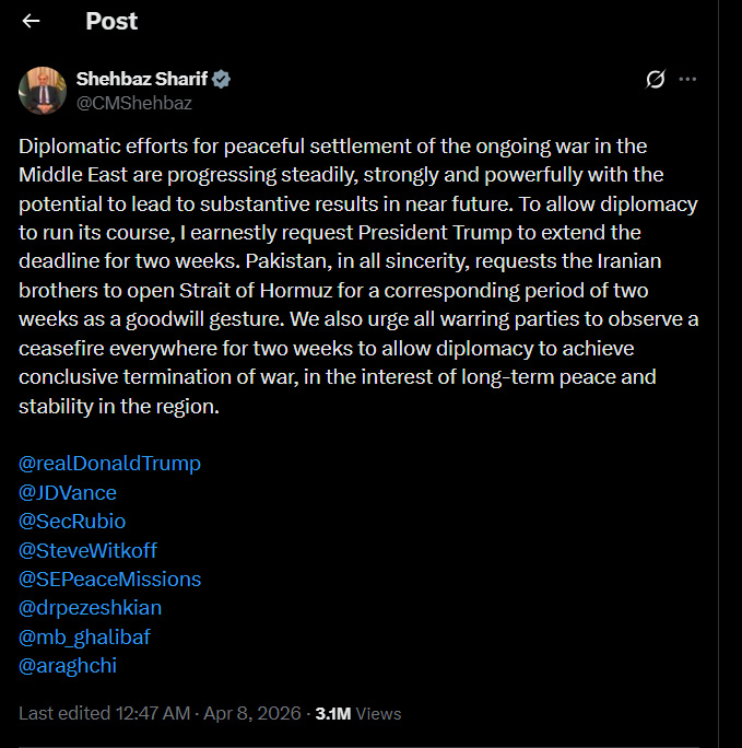'మధ్య ప్రాచ్యంలో జరుగుతున్న సంఘర్షణకు శాంతియుత పరిష్కారం కోసం దౌత్యపరమైన ప్రయత్నాలు వేగంగా కొనసాగుతున్నాయి. అతి త్వరలో ఫలితం ఉంటుంది. అందుకే ఇరాన్కి విధించిన గడువుని రెండు వారాలు పొడిగించాలని కోరుతున్నాను. ఇరాన్ కూడా హోర్మూజ్ జలసంధిని రెండు వారాల పాటు తెరవాలి. అదే సమయంలో అన్ని పక్షాలు కాల్పుల విరమణ ప్రకటించాలి అని విజ్ఞప్తి చేస్తున్నాను అని షెబాజ్ షరీఫ్ రాసుకొచ్చారు.