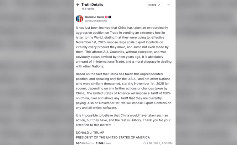 ‘చైనాలో విచిత్రమైన విషయాలు చోటుచేసుకుంటున్నాయి. అరుదైన ఖనిజాలపై పలు ఆంక్షలు విధించాలనుకుంటున్నారు. దీనిపై ప్రపంచం మొత్తానికి లేఖలు పంపుతున్నారు. అందరికీ శత్రువులుగా మారుతున్నారు. చైనాతో తాము కొంతకాలంగా తాము మంచి సంబంధాలే కొనసాగించినప్పటికీ.. ఇటీవలి కాలంలో వారి చర్యలు ఎంతో ఆశ్చర్యాన్ని కలిగిస్తున్నాయి. అందుకే దక్షిణ కొరియా పర్యటనలో జిన్పింగ్తో సమావేశం కావడానికి కారణాలు కనిపించడం లేదు. ఈ నేపధ్యంలోనే అమెరికా దిగుమతి చేసుకునే చైనా ఉత్పత్తులపై భారీగా సుంకాలు విధించాలనుకుంటున్నాం’ అంటూ అధ్యక్షుడు ట్రంప్ తన ట్రూత్ సోషల్ వేదికగా ప్రకటించారు. బీజింగ్ అసాధారణ రీతిలో దూకుడుగా వ్యవహరించినందుకు ప్రతీకారంగా అదనపు సుంకాలు విధిస్తామన్నారు. వీటికి తోడు అదనంగా అమెరికా ఎగుమతి నియంత్రణలు నవంబర్ ఒకటి నుంచి అమల్లోకి వస్తాయని ట్రంప్ పేర్కొన్నారు.