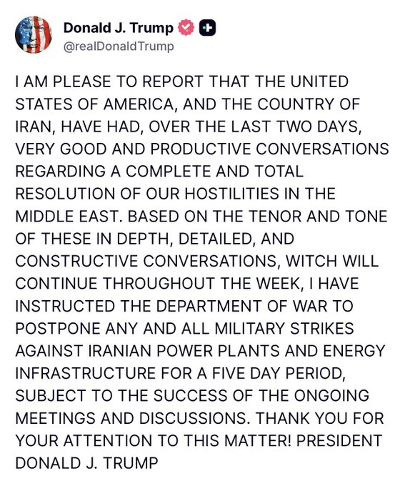 ట్రంప్ ట్రూత్ సోషల్లో పోస్ట్ చేస్తూ.. ‘ఈ విషయాన్ని హ్యాపీగా తెలియజేస్తున్నాను. యునైటెడ్ స్టేట్స్ ఆఫ్ అమెరికా, ఇరాన్ గత 2 రోజులుగా పశ్చిమాసియాలో ఘర్షణలకు పూర్తి పరిష్కారం దిశగా ఫలప్రదమైన చర్చలు జరిపాయి. ఈ నిర్మాణాత్మక చర్చల ఆధారంగా.. నేను మా యుద్ధ సైనికులను ఓ విషయం చెప్పాను. ఇరాన్ విద్యుత్ కేంద్రాలు, ఎనర్జీ మౌలిక సదుపాయాలపై జరిగే అన్ని సైనిక దాడులను 5 రోజులపాటు వాయిదా వేయాలని ఆదేశించాను’ అని అన్నారు.