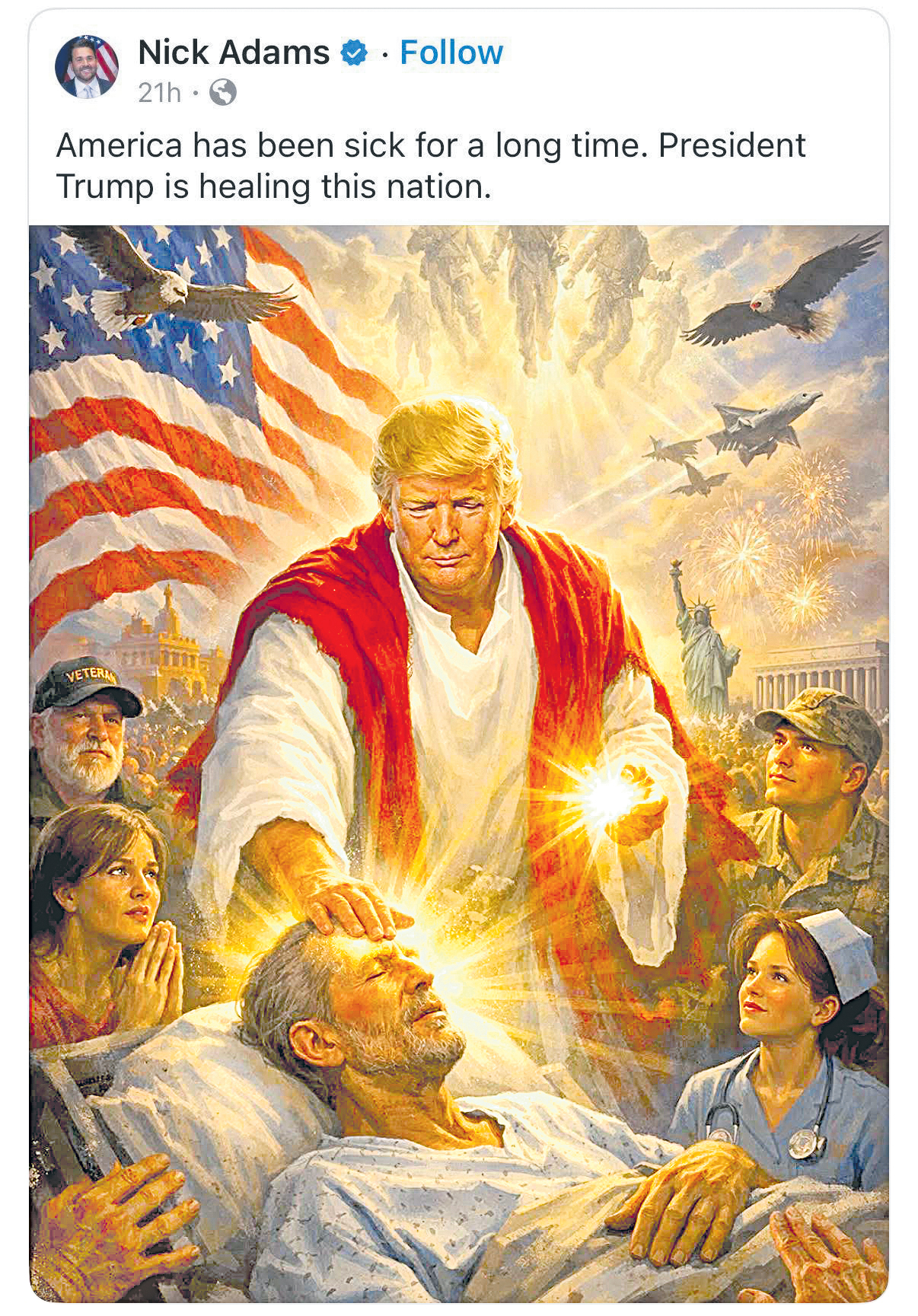 క్రీస్తు మాదిరిగా దివ్య శక్తులతో అమెరికాకు తాను హీలింగ్ చేస్తున్నట్టుగా ఉన్న ఈ ఏఐ ఆధారిత ఫొటోను ట్రంప్ ట్రూత్ సోషల్లో పోస్టు చేశారు. తీవ్ర విమర్శలు వెల్లువెత్తడంతో కాసేపటికే దాన్ని డిలీట్ చేశారు.