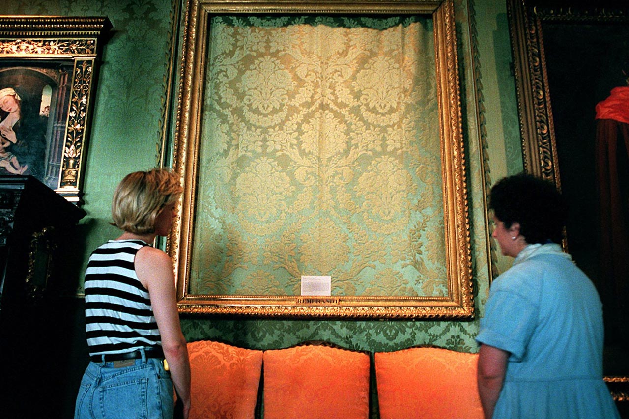 1990 మార్చి 18వ తేదీన ఇద్దరు వ్యక్తులు పోలీసుల వేషంలో మ్యూజియంకు వచ్చారు. డిస్టర్బెన్స్ కాల్ ఉందని చెబుతూ లోపలికి వెళ్లి.. భద్రతా సిబ్బందిని గంటపాటు బంధించి తమ పని కానిచ్చారు. మొత్తం 13 కళా వస్తువులను దొంగిలించగా.. అందులో రెంబ్రాంట్, వెర్మీర్, డెగా.. లాంటి పాపులర్ పెయింటింగ్స్ ఉన్నాయి. ఎఫ్బీఐ, ఇంటర్పోల్ రంగంలోకి దిగినా.. దొంగల ఆచూకీని కనిపెట్టలేకపోయాయి. ఈ కేసుకు సంబంధించి 10 మిలియన్ డాలర్ల రివార్డు ప్రకటించినా ఫలితం లేకపోయింది. దీంతో ఆ మ్యూజియంలో అవి దొరకకపోతాయా? అనే ఆశతో ఖాళీ ఫ్రేమ్లను వేలాడదీయడం చూడొచ్చు.