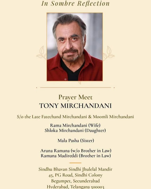 సీనియర్ నటుడు-రచయిత టోనీ మీర్కాందనీ తుదిశ్వాస విడిచారు. గత కొన్నాళ్లుగా పలు అనారోగ్య సమస్యలతో బాధపడుతున్న ఈయన.. హైదరాబాద్ బేగంపేటలోని తన నివాసంలో సోమవారం ఉదయం మృతి చెందారు. 2003లో వచ్చిన 'కోయి మిల్ గయా' హిందీ మూవీలో నటించి గుర్తింపు తెచ్చుకున్నారు.
