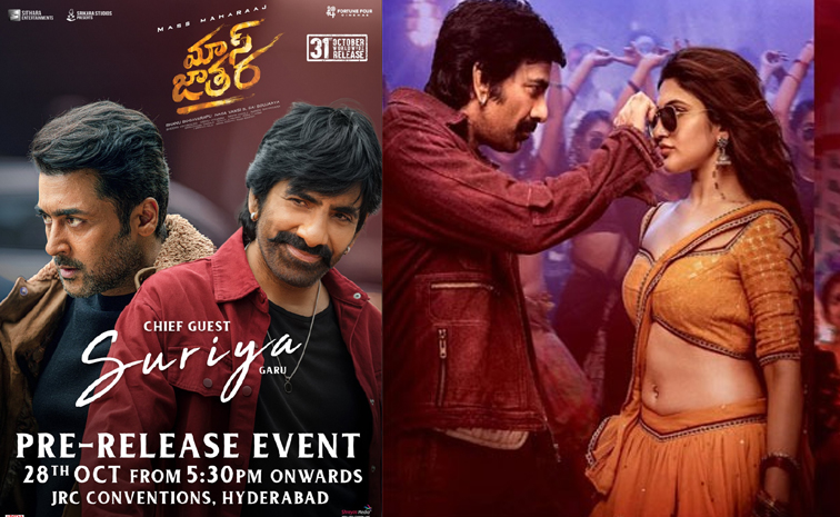 'మాస్ జాతర'(Mass Jathara) కోసం కోలీవుడ్ నటుడు 'సూర్య' వచ్చేస్తున్నారు. ధమాకా లాంటి భారీ విజయం తర్వాత హీరో రవితేజ, హీరోయిన్ శ్రీలీల జోడీగా నటిస్తున్న చిత్రం మాస్ జాతర.. ఈ చిత్రంలో రైల్వే పోలీస్ లక్ష్మణ్ భేరి పాత్ర చేస్తున్నారు రవితేజ. విలన్గా నవీన్ చంద్ర కనిపిస్తారు. సూర్యదేవర నాగవంశీ, సాయి సౌజన్య సంయుక్తంగా నిర్మిస్తున్న ఈ సినిమా అక్టోబరు 31న ప్రేక్షకుల ముందుకు రానుంది. ఈ క్రమంలో ఈ నెల28న ప్రీ-రిలీజ్ ఈవెంట్ను చిత్ర యూనిట్ ప్లాన్ చేసింది.