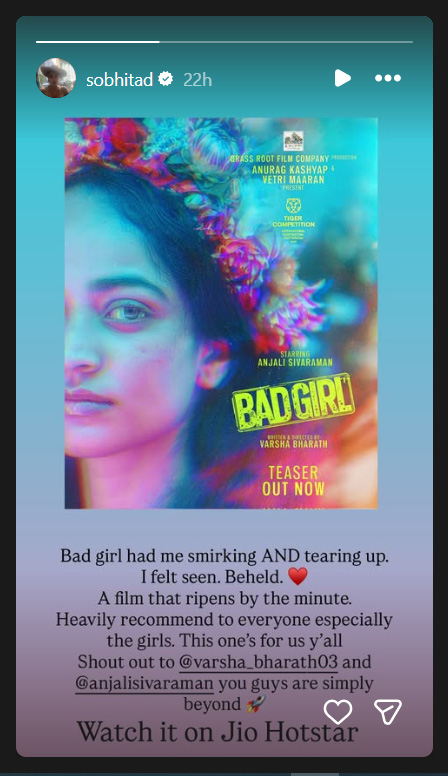 'బ్యాడ్ గర్ల్.. నన్ను నవ్వించింది, ఏడిపించింది. మంచి సినిమా చూసిన అనుభూతి కలిగించింది. అందరూ చూడాల్సిన చిత్రం. ముఖ్యంగా అమ్మాయిలకు దీన్నికచ్చితంగా చూడమని చెబుతున్నాను. ఇది మనకోసం.. వర్ష భరత్, అంజలి శివరామన్ని అభినందించాలి' అని శోభిత తన ఇన్ స్టాలో స్టోరీ పోస్ట్ చేసింది.
