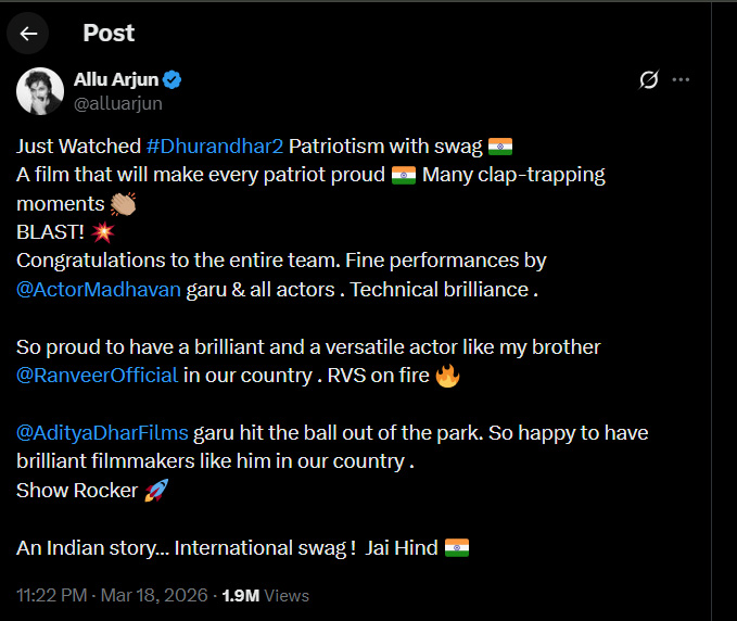 'దేశభక్తి, స్వాగ్తో ఇప్పుడే 'ధురంధర్ 2' చూశాను. ప్రతి భారతీయుడిని గర్వంగా ఫీలయ్యేలా చేసింది. సినిమాలో క్లాప్స్ కొట్టే సందర్భాలెన్నో. చిత్రబృందానికి శుభాకాంక్షలు. మాధవన్ సహా నటీనటులు అందరూ అదరగొట్టేశారు. నీలాంటి భిన్నమైన యాక్టర్ దేశంలో ఉండటం గర్వకారణంగా ఉంది బ్రదర్ రణ్వీర్ సింగ్. ఆదిత్య ధర్.. మరోసారి బ్లాక్బస్టర్ కొట్టేశాడు. నీలాంటి దర్శకులు మన దేశంలో ఉన్నందుకు గర్వంగా ఉంది. షో రాకర్. ఇది ఇంటర్నేషనల్ స్వాగ్తో తీసిన భారతీయ కథ. జైహింద్' అని అల్లు అర్జున్ ట్వీట్ చేశాడు.