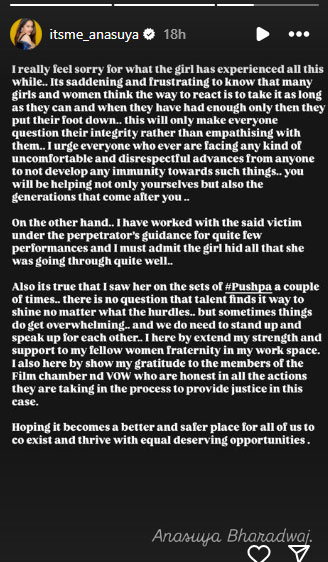 కానీ, మనసులో దాచుకొని బాధపడడం వల్ల ఎలాంటి లాభం లేదు. నేను పనిచేసే చోట మహిళలకు ఇలాంటి ఇబ్బందికర పరిస్థితులు ఎదురైతే వెంటనే స్పందిస్తాను. ఈ వ్యవహారంలో కూడా బాధితురాలికి న్యాయం జరుగుతుందని భావిస్తున్నాను. ఇందుకోసం సపోర్టుగా ఉన్న ఫిలిం ఛాంబర్ తో పాటు ఓడబ్ల్యు సభ్యులకు కృతజ్ఞతలు. రాబోయే రోజుల్లో ఇండస్ట్రీలో ఏ మహిళకు ఇలాంటి పరిస్థితులు ఎదురుకాకూడదని కోరుకుంటున్నాను’అని అనసూయ రాసుకొచ్చింది.