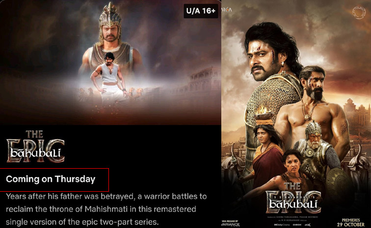 'బాహుబలి: ది ఎపిక్' ఓటీటీలోకి వచ్చేస్తుంది. ఈమేరకు అధికారికంగా ప్రకటించారు. పాన్ ఇండియాను ఊపేసిన బాహుబలి ప్రాంఛైజ్ రెండు సినిమాలు పదేళ్ల తర్వాత ఒక్కటిగా 'బాహుబలి: ది ఎపిక్’ పేరుతో అక్టోబర్ 31న విడుదలైన విషయం తెలిసిందే. ప్రభాస్- ఎస్.ఎస్. రాజమౌళి కాంబినేషన్లో వచ్చిన బాహుబలి రెండు భాగాలు సంచలన విజయం సాధించాయి. అయితే, బాహుబలి ది ఎపిక్ పేరుతో 3 గంటల 40 నిమిషాల నిడివితో మరోసారి ఈ చిత్రం ప్రేక్షకులను మెప్పించింది.