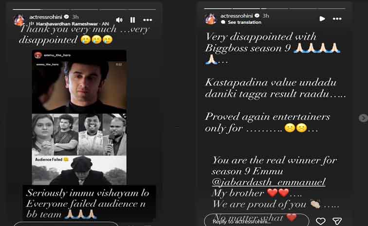అతడి విషయంలో బిగ్బాస్ టీమ్, ప్రేక్షకులు.. ప్రతి ఒక్కరూ ఫెయిల్ అయ్యారు అని ఇన్స్టాగ్రామ్ స్టోరీలో పోస్ట్ పెట్టింది. బిగ్బాస్ 9 సీజన్ నన్ను చాలా డిసప్పాయింట్ చేసింది. కష్టపడినా విలువ ఉండదు, దానికి తగ్గ ఫలితం రాదు. మీ దృష్టిలో ఎంటర్టైనర్స్కు ఏ స్థానం ఉందో మళ్లీ నిరూపించారు. ఇమ్మూ.. ఈ సీజన్కు నిజమైన విజేత నువ్వే.. నిన్ను చూస్తే చాలా గర్వంగా ఉంది అని రాసుకొచ్చింది. బిగ్బాస్కో దండం అన్నట్లుగా చేతులెత్తి జోడిస్తున్న ఎమోజీలను జత చేసింది.