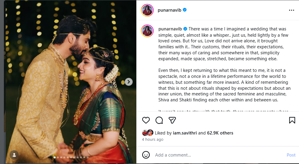 సమయం వచ్చింది కాబట్టి మా పెళ్లి జరగలేదు, నేను సిద్ధంగా ఉన్నాను కాబట్టే ఈ వేడుక జరిగింది. నేను ఊహించినంత సులభంగా ఈ పెళ్లి జరగలేదు. కానీ, ఎంతో నిజాయితీగా, అందంగా, అర్థవంతంగా వివాహం జరిగింది అని రాసుకొచ్చింది. ఇది చూసిన అభిమానులు కొత్త జంటకు శుభాకాంక్షలు తెలియజేస్తున్నారు. తెలుగు బిగ్బాస్ మూడో సీజన్లో పాల్గొన్న పునర్నవి.. ఉయ్యాల జంపాల, పిట్టగోడ, సైకిల్ వంటి పలు చిత్రాల్లో నటించింది.