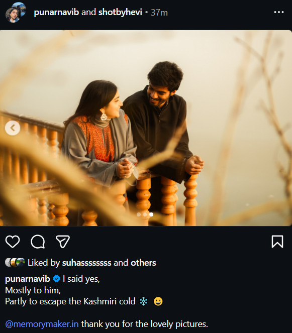 ఇకపోతే కొన్నిరోజుల క్రితమే రాహుల్ సిప్లిగంజ్.. హరిణ్య అనే అమ్మాయిని పెళ్లి చేసుకున్నాడు. ఇప్పుడు పునర్నవి కూడా త్వరలో వివాహం చేసుకోబోతున్నట్లు హింట్ ఇచ్చేసింది. తన ప్రియుడిని సోషల్ మీడియా వేదికగా అందరికీ పరిచయం చేసింది. కశ్మీర్లో అతడు తనకు ప్రపోజ్ చేయగా 'యస్' చెప్పినట్లు సోషల్ మీడియాలో పోస్ట్ పెట్టింది. పునర్నవి ప్రియుడి పేరు హేమంత్ వర్మ. ఇతడో ఫొటోగ్రాఫర్ అని తెలుస్తోంది.