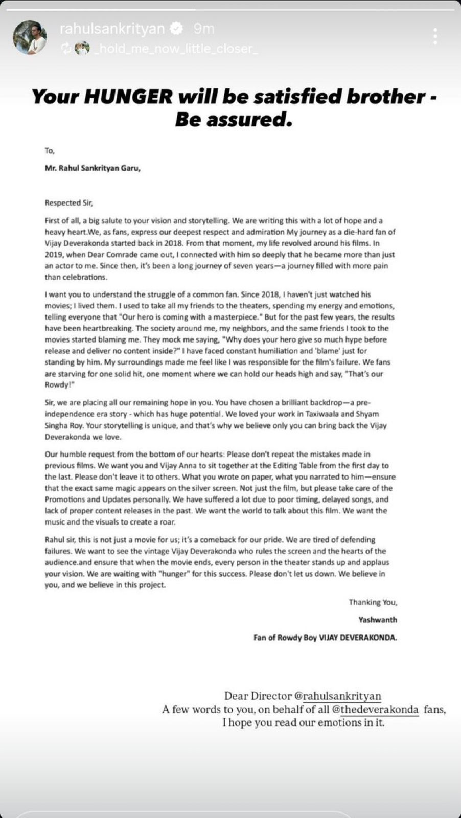 ‘టాక్సీవాలా’ తర్వాత విజయ్ దేవరకొండ, దర్శకుడు రాహుల్ సంకృత్యన్ కాంబినేషన్లో వీడీ14 సినిమా తెరకెక్కుతున్న సంగతి తెలిసిందే. ఈ నేపథ్యంలో ఈ సారి తమ హీరో విజయ్ దేవరకొండ కు మంచి హిట్ మూవీ ఇవ్వాలంటూ ఫ్యాన్స్ సోషల్ మీడియా వేదికగా డైరెక్టర్ రాహుల్ కు రిక్వెస్ట్స్ పంపుతున్నారు.