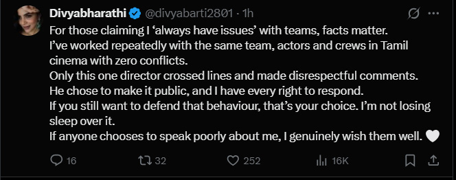 మరో ట్వీట్లో తమిళ, తెలుగు చిత్రసీమ గురించి తేడాలు చెప్పుకొచ్చింది. 'నాతో ఎప్పుడూ సమస్యలే అని చెప్పేవాళ్లకు చెబుతున్నాను. నిజాలే మాట్లాడతాయి. తమిళ ఇండస్ట్రీలో అదే టీమ్, అదే నటీనటులతో ఎలాంటి ఇబ్బంది లేకుండా మళ్లీ మళ్లీ పనిచేశాను. కానీ ఈ ఒక్క దర్శకుడు మాత్రమే గీత దాటి ప్రవర్తించాడు. అవమానించేలా నాపై కామెంట్స్ చేశాడు. వాటిని బయటపెట్టాడు. అందుకే నేను స్పందించాల్సి వచ్చింది. ఇంకా నిన్ను నువ్వు సమర్థించుకుంటే మాత్రం అది నీ ఇష్టం' అని దివ్య భారతి రిప్లై ఇచ్చింది.