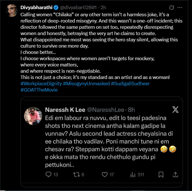 'మహిళలని చిలక లేదా మరేదైనా పదంతో పిలవడం జోక్ ఏం కాదు. ఇది ఆడవాళ్లపై నీకెంత ద్వేషముందో చెబుతోంది. ఇదొక్కటే కాదు సెట్లోనూ ఇతడు ఇలానే ప్రవర్తించేవాడు. పదేపదే మహిళల్ని కించపరుస్తూ తన కళకే ద్రోహం చేశాడు. ఈ మొత్తం వ్యవహారంలో హీరో మౌనంగా ఉండటం చూసి నేను చాలా బాధపడ్డాను. దీనివల్ల దర్శకుడికి చనువిచ్చినట్లు అయింది' అని దివ్య భారతి తన ఆవేదన వ్యక్తం చేసింది.