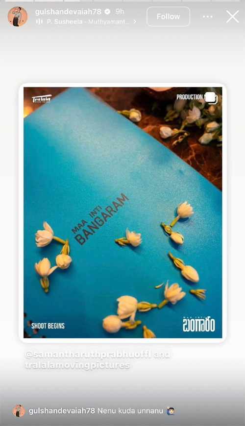 మయాసైటిస్ కారణంగా చాన్నాళ్లుగా యాక్టింగ్ పక్కనబెట్టేసిన సమంత.. ఈ ఏడాది నిర్మాతగా 'శుభం' అనే మూవీని రిలీజ్ చేసింది. ఇప్పుడు తనే నిర్మాత కమ్ హీరోయిన్గా 'మా ఇంటి బంగారం' అనే చిత్రంలో నటిస్తోంది. దసరాకు పూజతో లాంఛనంగా మొదలైన ఈ ప్రాజెక్ట్ షూటింగ్ కూడా ఇప్పుడు షురా అయిపోయింది. ఆ విషయాన్ని వెల్లడిస్తూ ఇన్ స్టాలో పోస్ట్ కూడా పెట్టారు.
