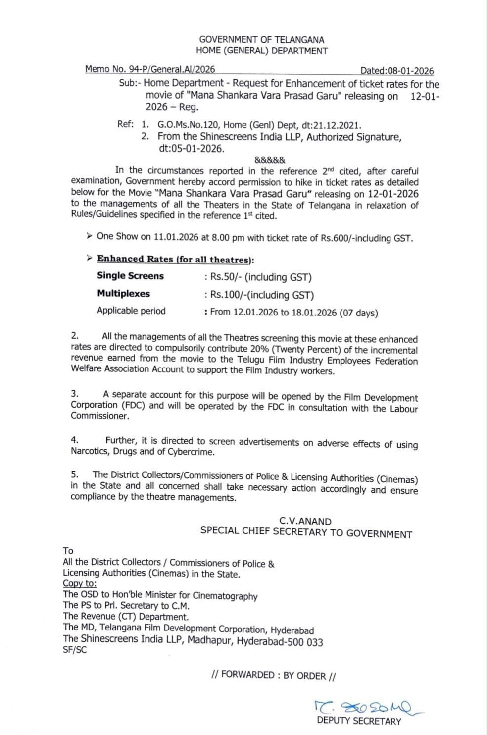 ప్రభాస్ 'రాజాసాబ్' చిత్రానికి తెలంగాణలో టికెట్ ధరలు పెంచినందుకే హైకోర్టు ఆగ్రహం వ్యక్తం చేసింది. దీంతో చిరంజీవి 'మన శంకరవరప్రసాద్ గారు'కి పెంపు ఉంటుందా లేదా అని అందరూ మాట్లాడుకున్నారు. కానీ తెలంగాణ ప్రభుత్వం నుంచి జీవో వచ్చింది. ఈ మేరకు అధికారిక ప్రకటన చేశారు. 11వ తేదీన వేసే ప్రీమియర్ల ఒక్కో టికెట్ రూ.600గా నిర్ణయించారు.