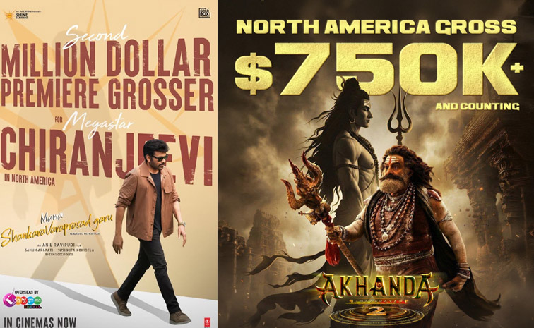 బాలకృష్ణ - బోయపాటి శ్రీను దర్శకత్వంలో తెరకెక్కిన చిత్రం ‘అఖండ 2’. ఉత్తర అమెరికాలో ఈ మూవీ ఫైనల్ కలెక్షన్స్ 1 మిలియన్ డాలర్స్ (రూ. 9కోట్లు) రాబట్టింది. అయితే, 'మన శంకరవరప్రసాద్ గారు' కేవలం ప్రీమియర్స్ ద్వారానే 1.2 మిలియన్ డాలర్స్( రూ.11కోట్లు) రాబట్టాడు. దీంతో ఇండస్ట్రీ కూడా ఆశ్యర్యపోతుంది. భారీ సినిమాలు పోటీ ఉండగా ఇంతటి రేంజ్లో కలెక్షన్స్ రావడంతో ఫ్యాన్స్ వైరల్ చేస్తున్నారు. తెలుగు రాష్ట్రాల్లో బుక్మైషోలో కేవలం 24గంటల్లో 5లక్షలకు పైగా టికెట్లు కొనుగోలు చేశారు.
