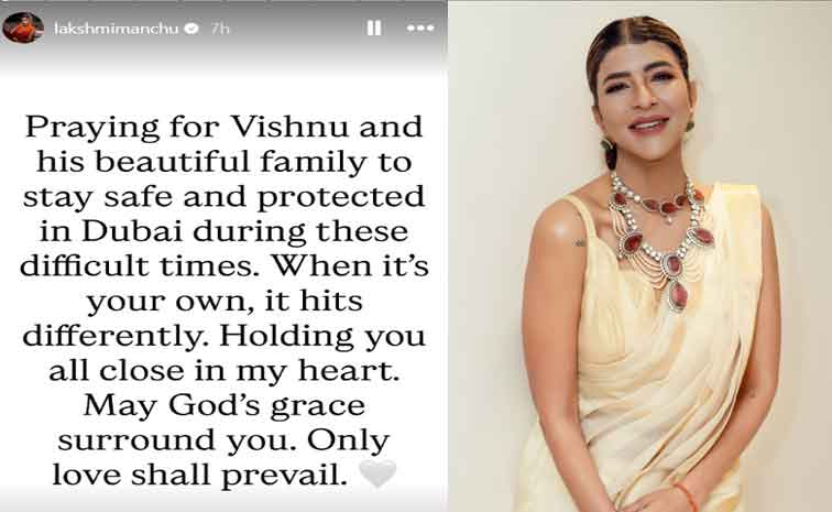 ఈ క్రమంలో మంచు విష్ణు సోదరి, నటి లక్ష్మీ మంచు ఇన్స్టాగ్రామ్ స్టోరీలో ఓ ఎమోషనల్ పోస్ట్ పెట్టింది. దుబాయ్లో ఉన్న విష్ణు, అతడి కుటుంబం క్షేమంగా ఉండాలని దేవుడిని ప్రార్థిస్తున్నాను. మనకు బాగా కావాల్సిన వారు ఇలాంటి పరిస్థితుల్లో ఉంటే తట్టుకోవడం చాలా కష్టం. మీ అందర్నీ నా హృదయానికి దగ్గరగా ఉంచుకుంటాను. ఆ దేవుడి దయ మీకు రక్షణగా ఉండాలని ఆశిస్తున్నాను. ఎప్పటికీ ప్రేమే గెలుస్తుంది అని రాసుకొచ్చింది.