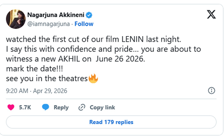 అఖిల్, భాగ్య శ్రీ బోర్సే హీరోహీరోయిన్లుగా నటించిన 'లెనిన్' మూవీని మే 01న థియేటర్లలోకి తీసుకొస్తామని తొలుత ప్రకటించారు. కానీ షూటింగ్, ఇతరత్రా పనులు పూర్తి కాకపోవడంతో వాయిదా వేసుకున్నారు. జూన్ 26న రిలీజ్ చేస్తామని అధికారికంగా అనౌన్స్ చేశారు. కానీ రామ్ చరణ్ 'పెద్ది' కూడా జూన్ 25న వస్తుందనేసరికి అఖిల్ సైడ్ అవుతాడని అనుకున్నారు. కానీ చెప్పిన తేదీకే వస్తున్నారు. ఈ విషయాన్ని నిర్మాతల్లో ఒకరైన నాగార్జున స్పష్టం చేశారు.
