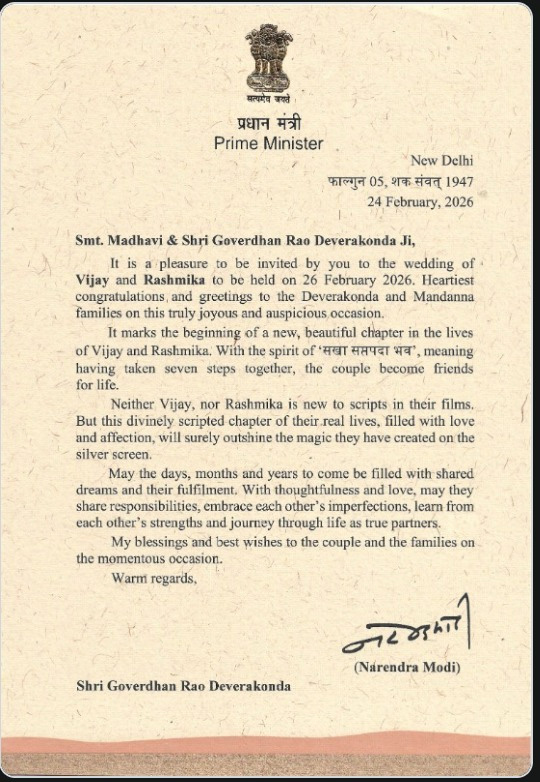 విజయ్-రష్మిక వివాహ వేడుకకు ఆహ్వానం అందుకోవడం ఆనందంగా ఉందని పేర్కొన్న మోదీ.. తన తరఫున శుభాకాంక్షలు తెలిపారు. విజయ్-రష్మిక జీవితంలో ఇది ఓ కొత్త, సుందరమైన అధ్యాయానికి నాంది అని పేర్కొన్నారు. సప్తపది అనే పవిత్ర సంప్రదాయంతో ఏడడుగులు కలిసి వేస్తూ జీవితాంతం స్నేహితులు, భాగస్వాములుగా మారుతున్నారని అన్నారు. సినిమాల్లో ఇప్పటికే ఎన్నో పాత్రలు చేసిన విజయ్, రష్మిక.. నిజ జీవితంలో ప్రేమ, అనురాగాలతో నిండిన కొత్త అధ్యాయాన్ని మరింత అందంగా నిర్మించుకుంటారని ఆశాభావం వ్యక్తం చేశారు. పరస్పర గౌరవంతో జీవిత ప్రయాణాన్ని కొనసాగించాలని ఆకాంక్షించారు. ఈ శుభసందర్భంగా వధూవరులకు, వారి కుటుంబ సభ్యులకు తన ఆశీస్సులు, శుభాకాంక్షలు తెలియజేస్తున్నట్లు ప్రధాని నరేంద్ర మోదీ తెలిపారు.