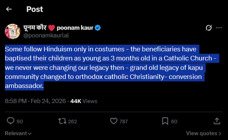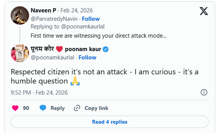 'మూడు నెలల వయసున్నప్పుడే విదేశాలకు తీసుకెళ్లి పిల్లలకు బాప్టిజం ఇప్పించి, తన వారసత్వాన్ని ఆర్థోడాక్స్ క్యాథలిక్ కైస్తవంలోకి ఎందుకు మార్చారు? హిందువుగా ఉండటం అంటే కేవలం రాజకీయ డ్రామా కోసమే ఆ దుస్తులు ధరిస్తున్నారా?' అని పూనమ్ కౌర్ ట్వీట్ చేసింది. నేరుగా ఎటాక్కి దిగారుగా అని ఓ నెటిజన్ రీట్వీట్ చేయగా.. ఇది ఎటాక్ కాదని, తనకు వచ్చిన ఓ సందేహం మాత్రమేనని పూనమ్ చెప్పుకొచ్చింది. పేరు చెప్పనప్పటికీ.. పూనమ్ ప్రస్తావించింది పవన్ గురించే అనే కామెంట్స్ వినిపిస్తున్నాయి.