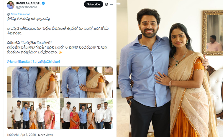 చిరంజీవి 'సూర్యతేజ చిలుకూరి'- చిరంజీవి లక్ష్మీ సౌభాగ్యవతి 'జనని బండ్ల'ల వివాహ సందర్భంగా పసుపు కుంకుమ కార్యక్రమం నిర్వహించాం అని తెలిపాడు. ఈ ఫంక్షన్కు సంబంధించిన ఫోటోలను కూడా సామాజిక మాధ్యమాల్లో షేర్ చేశాడు. అందులో తమ వియ్యంకులతో పాటు కాబోయే అల్లుడి ఫోటోలు కూడా ఉన్నాయి. ఇది చూసిన అభిమానులు బండ్ల గణేశ్ కుటుంబానికి శుభాకాంక్షలు తెలియజేస్తున్నారు.