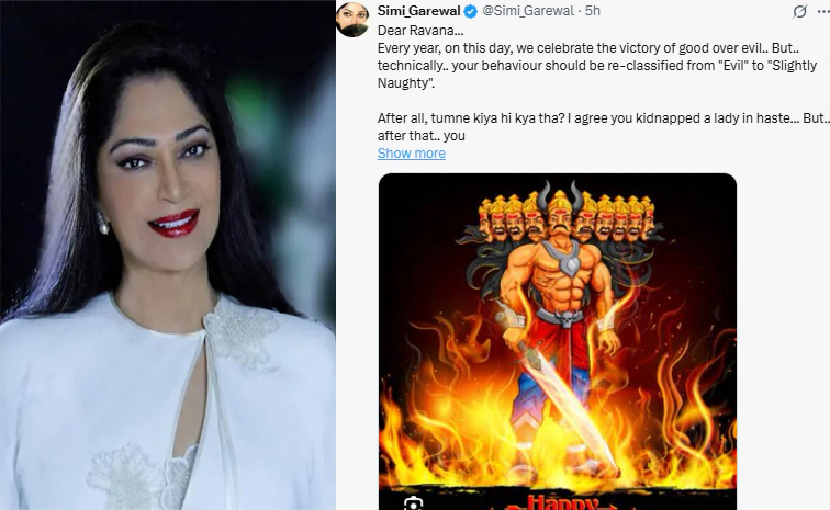 రావణుడి బొమ్మను కాల్చడానికి నాకెటువంటి అభ్యంతరం లేదు. కానీ ఆయనేం చేశారన్నదే నా ప్రశ్న.. అంతే! హ్యాపీ దసరా అని ట్వీట్ చేసింది. ఈ పోస్ట్పై విమర్శలు వెల్లువెత్తడంతో సదరు ట్వీట్ను డిలీట్ చేసింది. కాగా సిమి గరేవాల్.. దో బడాన్, మేరా నామ్ జోకర్, కర్జ్ వంటి సినిమాల్లో నటించింది. యాంకర్గా టాక్ షోలు కూడా చేసింది. కొన్ని సీరియల్స్, సినిమాలకు డైరెక్టర్గానూ వ్యవహరించింది.