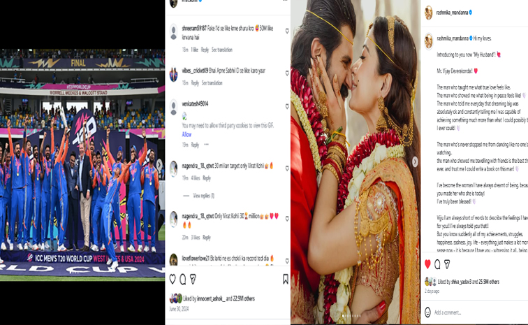 2024లో టీమిండియా వరల్డ్ కప్ గెలిచిన సందర్భంగా విరాట్ కోహ్లీ ఫోటోను షేర్ చేశారు. ఈ ఫోటోకు దాదాపు 23 మిలియన్ల లైక్స్ వచ్చాయి. తాజాగా ఆ రికార్డ్ను రష్మిక షేర్ చేసిన పెళ్లి ఫోటోలు బద్దలు కొట్టాయి. రష్మిక పోస్ట్కు ఏకంగా 25 మిలియన్లకు పైగా లైక్స్ వచ్చాయి. దీంతో విరాట్ పోస్ట్ రికార్డ్ను రష్మిక అధిగమించింది. కాగా.. ఇన్స్టాలో రష్మికకు 50 మిలియన్లకు పైగా ఫాలోవర్స్ ఉన్నారు. అంటే దాదాపు సగం మంది ఈ వెడ్డింగ్ ఫోటోలను లైక్ చేశారు. అంతేకాకుండా విజయ్ దేవరకొండ పోస్ట్ చేసిన ఫోటోలకు 19.8 మిలియన్ల లైక్ వచ్చాయి. కాగా.. మరోవైపు విరాట్కు ఇన్స్టాలో 274 మిలియన్ల మంది ఫాలోవర్స్ ఉన్నారు. రష్మిక పోస్ట్కు ఈ రేంజ్లో ఆదరణ దక్కడం చూస్తుంటే ఆమె క్రేజ్ ఏంటో తెలిసిపోతోంది.