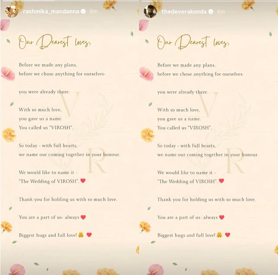 “మేం ఏదైనా ప్లాన్ చేసుకోవాలనుకున్నా, ముందే అభిమానులు ఆ పనులు చేసి పెడుతున్నారు. ఇప్పుడు పెళ్లి విషయంలోనూ చాలా ప్రేమతో ఒక పేరు పెట్టారు. అందువల్ల మా వివాహ వేడుకకు ‘వెడ్డింగ్ ఆఫ్ విరోష్’ అని పేరు పెట్టాలని నిర్ణయించుకున్నాం. మమ్మల్ని ఇంతగా ఆదరిస్తున్నందుకు ధన్యవాదాలు” అని విజయ్, రష్మిక పేర్కొన్నారు. ఈ జంట వివాహ వేడుక అతి కొద్ది మంది సమక్షంలో రాజస్థాన్లోని ఉదయ్పుర్లో జరగనుందని సమాచారం. ఫిబ్రవరి 26న విజయ్ – రష్మిక మూడుముళ్లతో ఒక్కటవుతున్నారు. మార్చి 4వ తేదీన హైదరాబాద్లోని హోటల్ తాజ్ కృష్ణలో రాత్రి 7 గంటలకు గ్రాండ్గా రిసెప్షన్ నిర్వహించనున్నారు. దీనికి సినీ, రాజకీయ ప్రముఖులు హాజరుకానున్నారు.