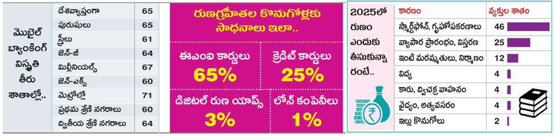 ఏడాదిలో వీటి విలువ ఏకంగా 18% పెరిగిందంటే జనం ఏ స్థాయిలో అప్పులు చేస్తున్నారో అర్థం చేసుకోవచ్చు. 67 కోట్ల యాక్టివ్ రుణ ఖాతాలున్నాయి. ఈ ఖాతాల సంఖ్య సంవత్సరంలో 7.1% దూసుకెళ్లింది. కన్జ్యూమర్ ఫైనాన్స్ కంపెనీ హోమ్ క్రెడిట్ ఇండియా 2025లో భారతీయుల రుణాల తీరుపై ఓ నివేదికను రూపొందించింది. ఈ ఏడాది రుణగ్రహీతల్లో 46% మంది స్మార్ట్ఫోన్ కొనుగోలుకే అప్పు చేశారని వెల్లడించింది. 25% మంది కొత్తగా వ్యాపారం ప్రారంభించడానికి, ఇప్పటికే ఉన్న వ్యాపారాన్ని తదుపరి స్థాయికి తీసుకెళ్లడానికి రుణం అందుకున్నారని తెలిపింది.