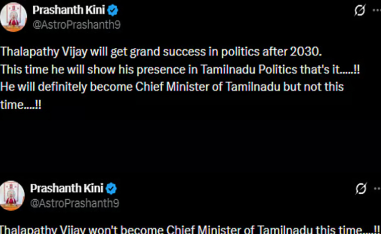 జ్యోతిష్కుడు ప్రశాంత్ కిని విజయ్ రాజకీయ గమనం గురించి చేసిన సోషల్ మీడియా పోస్ట్ వైరల్గా మారింది. “2030 తర్వాత దళపతి విజయ్ రాజకీయాల్లో గొప్ప విజయం సాధిస్తాడు. కానీ ఈసారి మాత్రం తమిళ రాజకీయాల్లో ఆయన ఉనికి చాటుకుంటాడు అంతే….!! ఆయన ఖచ్చితంగా తమిళనాడు ముఖ్యమంత్రి అవుతారు, కానీ ఈసారి కాదు….!! (sic).”