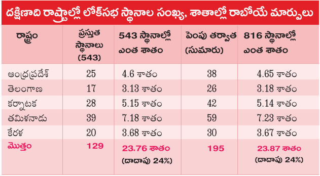తెలంగాణలో స్థానాలు 17 నుంచి 26కు, ప్రాతినిధ్యం 3.13 నుంచి 3.18కి పెరుగుతాయి. తమిళనాడులో సీట్లు 39 నుంచి 59కు, ప్రాతినిధ్యం 7.18 నుంచి 7.23 శాతానికి పెరుగుతాయి. కర్నాటకలో లోక్సభ స్థానాలు 28నుంచి 42కు, సభలో ప్రాతినిధ్యం 5.15 శాతం నుంచి 5.14 శాతానికి చేరతాయి. కేరళలో సీట్లు 20 నుంచి 30కి, లోక్సభలో ఆ రాష్ట్ర ప్రాతినిధ్యం 3.68 నుంచి 3.67 శాతానికి చేరతాయి. మొత్తమ్మీద దక్షిణాది రాష్ట్రాల లోక్సభ స్థానాల సంఖ్య 195కు పెరుగుతుంది. లోక్సభలో వాటి ప్రాతినిధ్యం 23.76 శాతం నుంచి 23.97 శాతానికి పెరుగుతుందే తప్ప ఏ మాత్రమూ తగ్గదు. అలాంటప్పుడు దక్షిణాదికి అన్యాయమన్న ప్రశ్నే తలెత్తదు’’అని స్పష్టం చేశారు.
