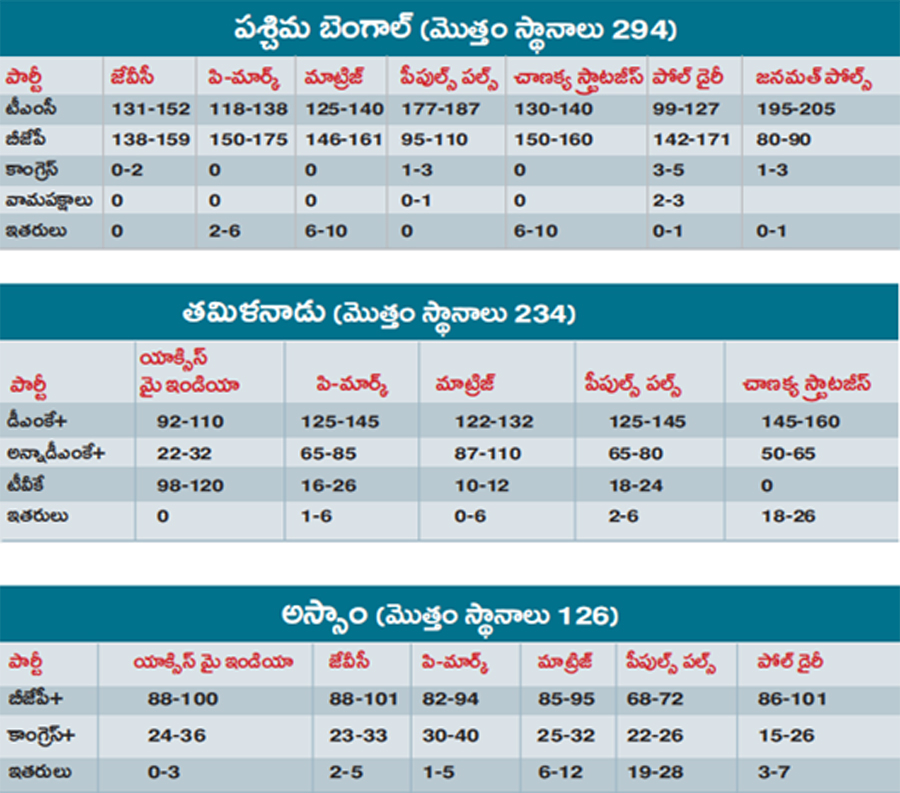 న్యూఢిల్లీ: పార్టీల పోటాపోటీ ప్రచారంతో హోరెత్తిన ఐదు రాష్ట్రాల అసెంబ్లీ ఎన్నికలకు సంబంధించిన ఎగ్జిట్పోల్స్ ఫలితాలు కూడా ఒకట్రెండు సంచలన అంచనాలతో హోరెత్తాయి.పశ్చిమ బెంగాల్లో తుది విడత పోలింగ్ బుధవారం సాయంత్రం ముగిసిన వెంటనే ఫలితాలను ఆయా సర్వే సంస్థలు ప్రకటించాయి. కీలక రాష్ట్రమైన బెంగాల్లో ఈసారి మమతా బెనర్జీ పార్టీకి పరాజయం తప్పదని కొన్ని సంస్థలు వెల్లడించగా, ఆమె వరుసగా నాలుగోసారి అధికారంలోకి రావడం తథ్యమని మరికొన్ని సంస్థలు అంచనా వేశాయి. మరో పెద్ద రాష్ట్రమైన తమిళనాడులో అధికార డీఎంకే కూటమి స్పష్టమైన మెజార్టీతో మళ్లీ జయకేతనం ఎగురవేయనున్నట్లు అత్యధిక ఎగ్జిట్ పోల్స్ ఫలితాలు తెలిపాయి. దళపతి విజయ్ నేతృత్వంలోని తమిళగ వెట్రి కళగం(టీవీకే) మూడో అతిపెద్ద పార్టీగా అవతరించే అవకాశాలు ఉన్నట్లు పేర్కొన్నాయి.