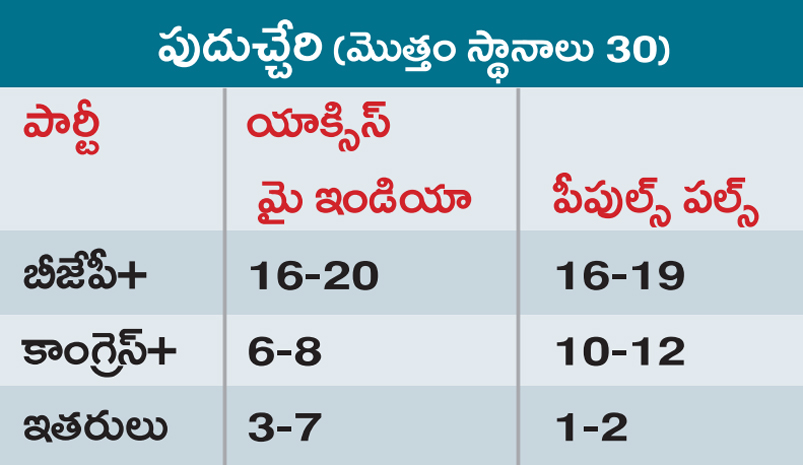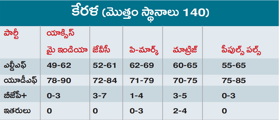 ఇక్కడ అన్నాడీఎంకే కూటమి రెండో స్థానంలో నిలుస్తుందని వెల్లడించాయి. అయితే విజయ్ మరో ఎంజీఆర్గా అవతరించబోతున్నారని యాక్సిస్ మై ఇండియా సంస్థ ప్రకటించడం గమనార్హం. టీవీకే పార్టీ 35 శాతం ఓట్లతో 98 నుంచి 120 స్థానాలు గెల్చుకొని అతిపెద్ద పార్టీగా నిలవబోతోందని ఆ సంస్థ తేల్చిచెప్పింది. అస్సాంలో ఎన్డీయే మరోసారి నెగ్గడం ఖాయమని ఎగ్జిట్ పోల్స్ ఫలితాలు స్పష్టంచేశాయి. కమ్యూనిస్టుల అడ్డా అయిన కేరళలో ఈసారి వారికి పరాభవం తప్పదని, పినరయి విజయన్ గద్దె దిగబోతున్నట్లు పేర్కొన్నాయి. రాష్ట్రంలో వామపక్ష కూటమి ఎల్డీఎఫ్ ఓడిపోతుందని, కాంగ్రెస్ నేతృత్వంలోని యూడీఎఫ్ అధికారంలోకి వచ్చే సూచనలున్నాయని వెల్లడించాయి. కేరళ ప్రజలు మార్పునకు అనుకూలంగా ఓటు వేశారని తెలిపాయి. పుదుచ్చేరిలో ఎన్డీయేకు మళ్లీ స్పష్టమైన విజయావకాశాలు ఉన్నట్లు అభిప్రాయపడ్డాయి.