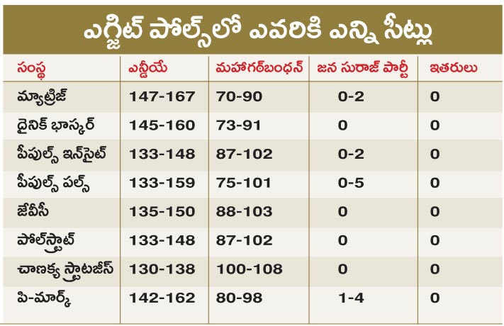 న్యూఢిల్లీ: బిహార్ అసెంబ్లీ ఎన్నికలు మంగళవారం ముగిశాయి. రెండు విడతల్లో జరిగిన పోలింగ్లో రికార్డుస్థాయిలో ఓటింగ్ నమోదైంది. సాయంత్రం 5 గంటలకు పోలింగ్ ముగిసిన తర్వాత ఎగ్జిట్ పోల్స్ ఫలితాలు వెల్లడయ్యాయి. బిహార్ అధికార పీఠం మరోసారి జాతీయ ప్రజాస్వామ్య కూటమి(ఎన్డీయే)కే దక్కబోతున్నట్లు మెజార్టీ ఎగ్జిట్ పోల్స్ తేలి్చచెప్పాయి. విపక్ష మహాగఠ్బంధన్కు నిరాశ తప్పదని పేర్కొన్నాయి.