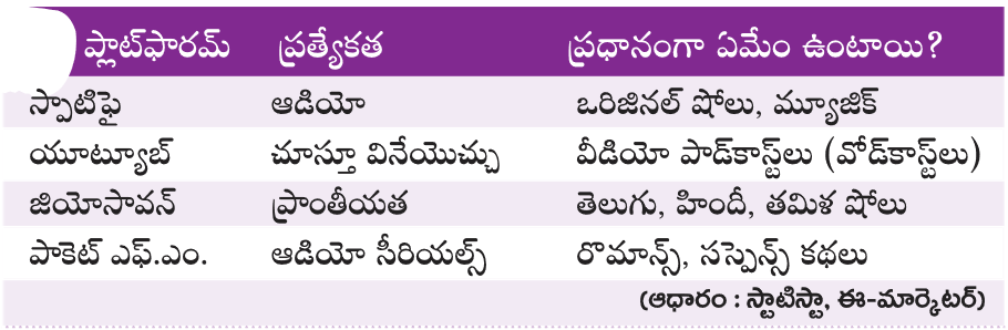 ప్రధానంగా యూట్యూబ్లో పాడ్కాస్ట్లనువింటున్నారు. యూట్యూబ్లోనే వీడియో పాడ్కాస్ట్లను చూస్తున్నారు. అలాగే కొన్ని మ్యూజిక్ యాప్స్ కూడా పాడ్కాస్ట్లనుఅందిస్తున్నాయి.