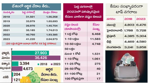 కోట్ల విలువైన మోసాలూ జరుగుతుండటం ఆందోళన కలిగించే అంశం. దేశవ్యాప్తంగా 2018లో పెద్ద నగరాల్లో 31,501 ఆర్థిక నేర సంబంధ కేసులు నమోదవగా, 2023లో ఈ సంఖ్య 41,220కి చేరింది. ఆ ఏడాది నగరాల్లో నేరాల రేటు లక్ష జనాభాకు 36.1గా ఉంది. దాదాపు 10లో 9 కేసులు ఫోర్జరీ, మోసానికి సంబంధించినవి. ఇటీవలి సంవత్సరాల్లో కేసుల సంఖ్య పెరిగినప్పటికీ.. కోర్టుల్లో పెండింగ్ కేసుల్లో తగ్గుదల నమోదైంది.