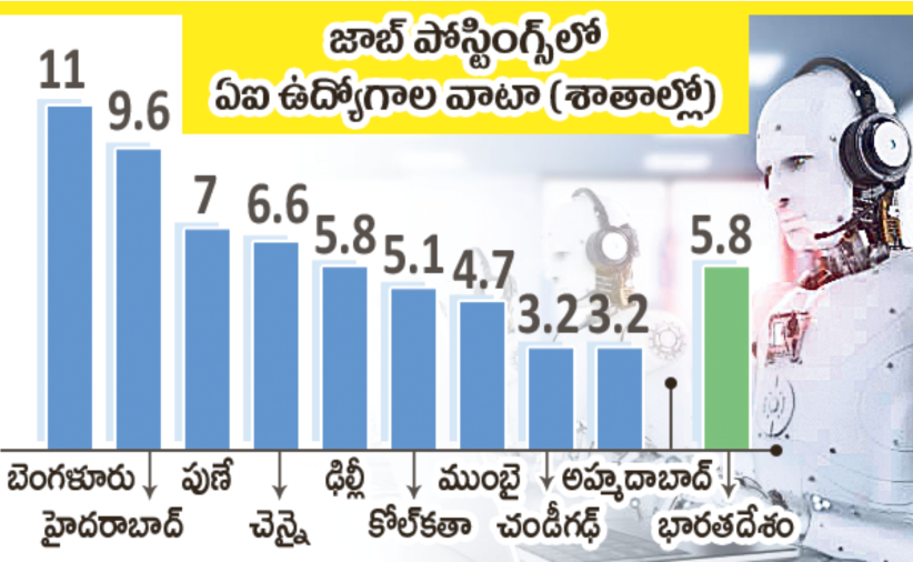 » మొత్తం జాబ్ పోస్టింగ్స్లో ఏఐ సంబంధ ఉద్యోగాల వాటా మన దేశంలో 5.8 శాతం.
