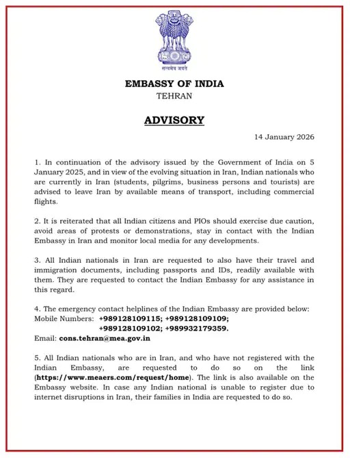 ఈ నెల 5న జారీ చేసిన అలర్ట్ తో పోలిస్తే.. పరిస్థితులు మరింతగా దిగజారుతున్నట్లు ఆందోళన వ్యక్తం చేసింది. నిరసనలు జరుగుతున్న ప్రదేశాలు, రద్దీ ప్రాంతాలకు వీలైనంత దూరంగా ఉండాలని సూచించింది. నిత్యం టెహ్రాన్లోని భారత రాయబార కార్యాలయ అధికారులతో టచ్లో ఉండాలని ఆదేశించింది. స్థానిక మీడియా ద్వారా ఎప్పటికప్పుడు అప్డేట్స్ తెలుసుకోవాలని పేర్కొంది.