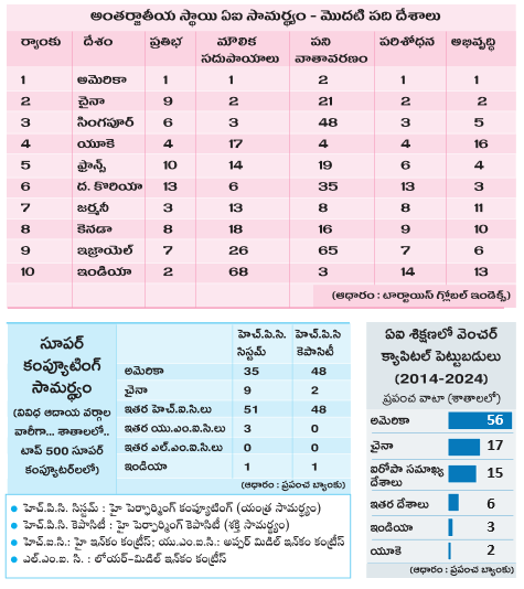 ఏఐ రంగంలో మెరికలు ఉన్న దేశంగా ఇండియా పేరు పొందింది. కానీ మౌలిక సదుపాయాల విషయంలో వెనుకబడి ఉంది. 2024 ‘టార్టాయిస్ గ్లోబల్ ఏఐ ఇండెక్స్’ ప్రకారం, ఏఐ సామర్థ్యంలో ఇండియా ప్రపంచంలో 10వ స్థానంలో ఉంది. ఏఐ నిపుణుల సంఖ్యలో మాత్రం 2వ స్థానంలో నిలిచింది.
