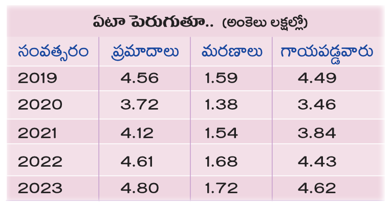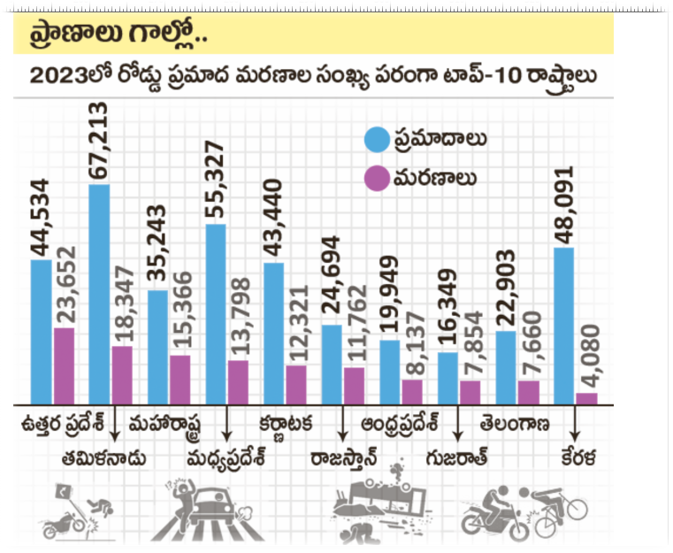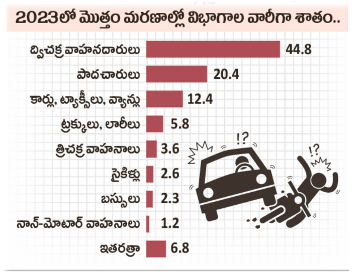 2023లో దేశవ్యాప్తంగా గంటకు సుమారు 55 రోడ్డు ప్రమాదాలు సంభవించాయి. ప్రమాద మృతుల్లో ద్విచక్ర వాహనదారులు ఏకంగా 44.8 శాతం ఉన్నారు. పాదచారులది (20.4 శాతం) ఆ తరువాతి స్థానం. ఇక గుంతల కారణంగా జరిగిన 5,840 ప్రమాదాల్లో 2,161 మంది కన్నుమూశారు.