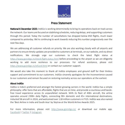 ఈమేరకు ప్రెస్నోట్ విడుదల చూస్తూ 850 కంటే తక్కువ విమాన సర్వీసుల్లో అంతరాయం ఉందని చెప్పింది.