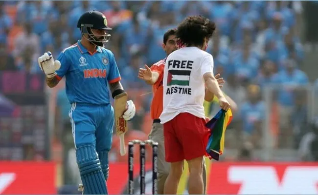 మైదానంలోకి దూసుకొచ్చిన వ్యక్తి పాలస్తీనాను ప్రతిబింబించే వేషధారణను కలిగి ఉన్నాడు. ఎర్రని షార్ట్ ధరించాడు. తెల్లని టీ షర్ట్ ముందు భాగంలో పాలస్తీనాపై బాంబు దాడులు నిలిపివేయండి అని పేర్కొని ఉంది. టీషర్ట్ వెనుక భాగంలో ఫ్రీ పాలస్తీనా అని రాసి ఉంది. పాలస్తీనా జెండాను ప్రతిబింబించేలా మాస్క్ను ధరించాడు. మ్యాచ్ జరుగుతుండగా.. ఎక్కసారిగా మైదానంలోకి దూసుకొచ్చాడు. క్రీజ్ వరకు చేరుకుని విరాట్ కోహ్లిని హత్తుకునే ప్రయత్నం చేశాడు. ఇంతలో రంగంలోకి దిగిన సిబ్బంది అతన్ని పట్టుకుని వెనక్కి తీసుకెళ్లారు.