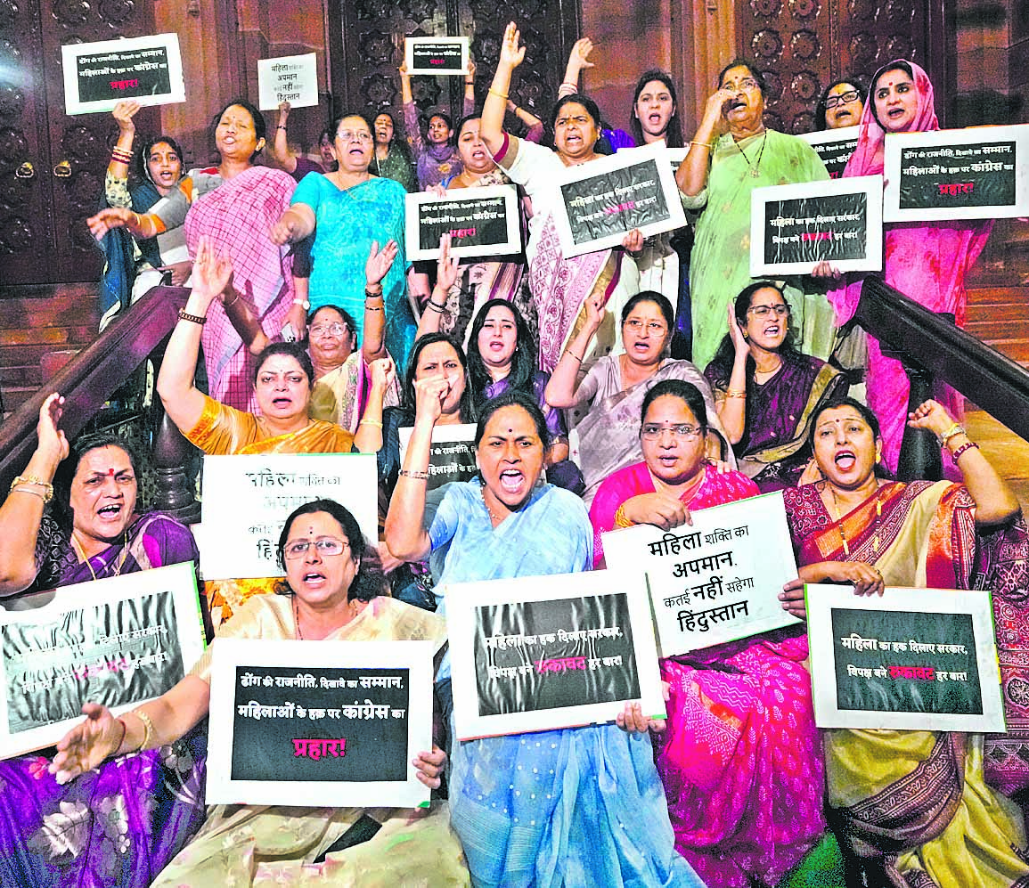 సవరణ బిల్లును విపక్షాలు ఓడించడాన్ని బీజేపీ మహిళా ఎంపీలు తీవ్రంగా నిరసించారు. శుక్రవారం సాయంత్రం లోక్సభ వాయిదా పడ్డ అనంతరం పార్లమెంటు ఆవరణలో వారు ధర్నాకు దిగారు. ‘మహిళలకు జరిగిన అవమానాన్ని భారత్ సహించబోదు’ అంటూ ప్లకార్డులు చేబూని నినాదాలు చేశారు. కేంద్ర మంత్రులు శోభా కరంద్లాజె, అన్నపూర్ణా దేవి, రక్షా ఖడ్సే, ఎంపీ కంగనా రనౌత్ తదితరులు ధర్నాలో పాల్గొన్నారు.