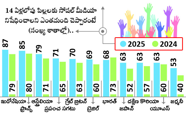 ఫ్రాన్స్కు చెందిన మార్కెట్ రిసర్చ్ కంపెనీ ఇప్సాస్ ఈ ఏడాది జూన్–జూలైలో 30 దేశాల్లో సర్వే చేపట్టింది. 18–75 ఏళ్ల వయసున్న 23,700 మంది ఇందులో పాలుపంచుకున్నారు. ఇప్సాస్ ఎడ్యుకేషన్ మానిటర్–2025 ప్రకారం.. 14 ఏళ్లలోపు పిల్లలకు సోషల్ మీడియా బ్యాన్ చేయాలంటూ 71% మంది తమ గళం వినిపించారు.