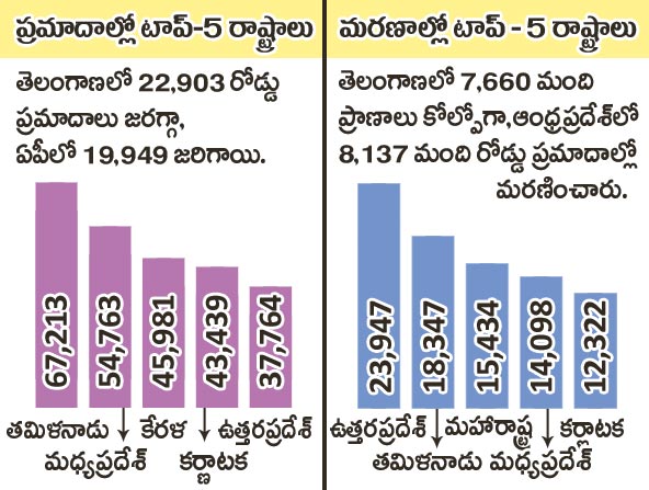 మహారాష్ట్రలో అత్యధికంగా 69,809 మంది ప్రమాదాల్లో మరణించగా, ఆ తరువాతి స్థానాల్లో మధ్యప్రదేశ్ (43,320), ఉత్తరప్రదేశ్ (43,207) ఉన్నాయి. ఆంధ్రప్రదేశ్లో 19,949 ప్రమాదాల్లో 17,039 మరణించగా, తెలంగాణలో 22,903 ప్రమాదాల్లో 13,374 మంది ప్రాణాలు కోల్పోయారు.