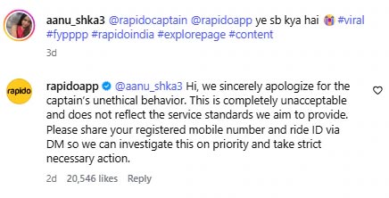ఆ డ్రైవర్ ప్రవర్తనను “అంగీకరించలేని చర్య”గా పేర్కొంటూ.. వినియోగదారుల గోప్యతను ఉల్లంఘించే ప్రవర్తన తమ సేవా ప్రమాణాలకు విరుద్ధమని స్పష్టం చేసింది. బాధితురాలు తన రిజిస్టర్డ్ మొబైల్ నంబర్, రైడ్ IDని డైరెక్ట్ మెసేజ్ ద్వారా పంపాలని కోరుతూ.. కఠిన చర్యలు తీసుకుంటామని హామీ ఇచ్చింది.