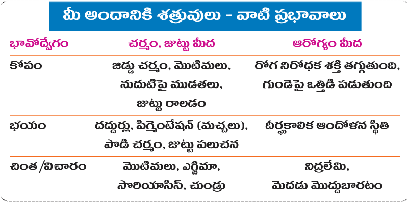 మీలోని భయం మీ శరీరాన్ని ఎప్పుడూ ‘యుద్ధం’ చేసే ఒత్తిడి మూడ్లో ఉంచుతుంది. ఫలితంగా చర్మం పొడిబారిపోతుంది. జుట్టు రాలడం మొదలవుతుంది. అంటే, పులి వచ్చి మీద పడబోతోందన్న భయంలో మీ శరీరం తత్తరపాటుగా ఉండి, అందాన్ని పట్టించుకోవడం మానేస్తుందన్నమాట!