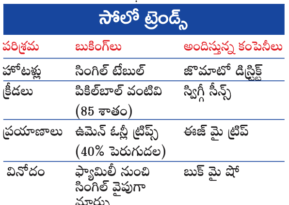 భోజనం, ప్రయాణం, వినోదం.. ఇప్పుడు సోలో జీవన శైలికి సంకేతంగా మారింది. లైవ్ ఈవెంట్లకు ఒక్కరే వెళ్లేవారు ఎక్కువయ్యారు. ఉదయ్పూర్, కూర్గ్, సిక్కిం వంటి సురక్షిత మైన ప్రాంతాలకు మహిళలు ఒంటరి ప్రయాణాలను ఎంచుకుంటున్నారు. డిమ్ లైట్ల డైనింగ్ హాళ్లలో టేబుల్కు ఒకరే కూర్చొని భోజనాన్ని ఆస్వాదిస్తున్నారు. ఇది ఖర్చు తగ్గించుకోవటం కాదు, ఎంతైనా ఖర్చుపెట్టి ఏకాంతాన్ని కొనుక్కోవటం.